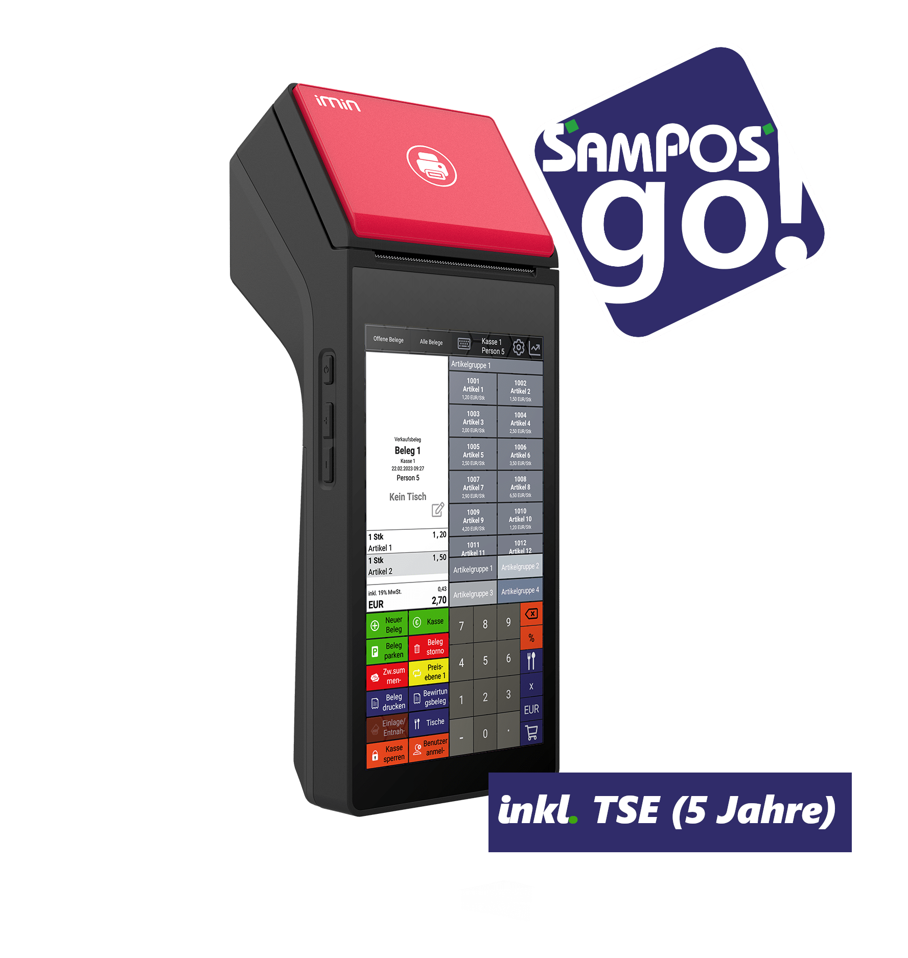 Kompakt, funktionell und mobil. Das iMin M2 mobile Android-POS System im SamPOS go!-Paket S bietet umfangreiche Leistung und hohe Qualität bei kompakten Abmessungen. Das helle, hochauflösende Display, der schnelle eingebaute Drucker und nicht zuletzt die umfangreiche Konnektivität (WiFi, Bluetooth, 4G) überzeugen auf ganzer Linie. Vorinstallierte Kassensoftware (ohne Abo-Verpflichtungen) und die TSE (mit 5 Jahren Laufzeit) gehören zum Lieferumfang. Optional ist eine Ladestation erhältlich.
